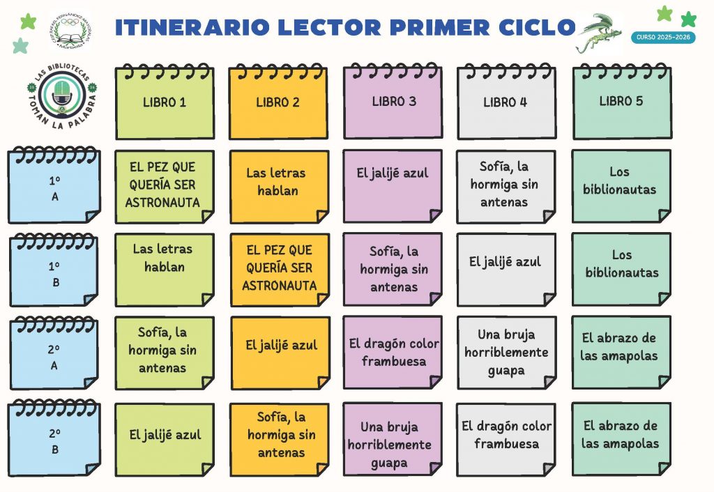 Desde la biblioteca escolar hemos puesto en marcha un itinerario lector pensado para todo nuestro alumnado. Con esta iniciativa queremos seguir impulsando el gusto por la lectura, convencidos de los innumerables beneficios que aporta: enriquece el vocabulario, mejora la comprensión, estimula la imaginación y abre la puerta a nuevos conocimientos y experiencias.