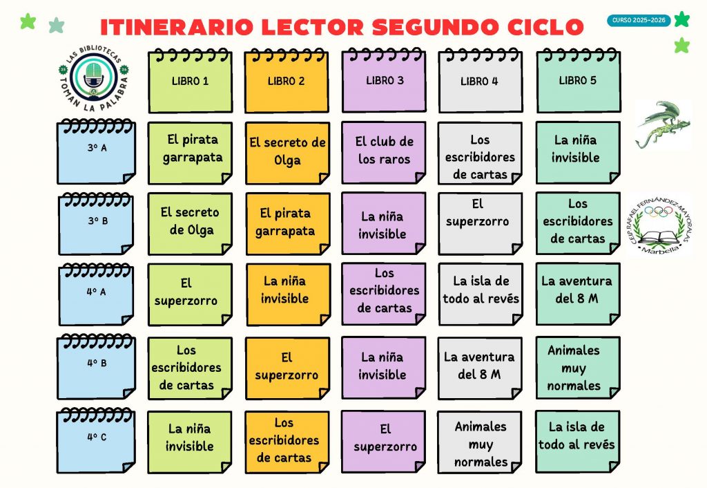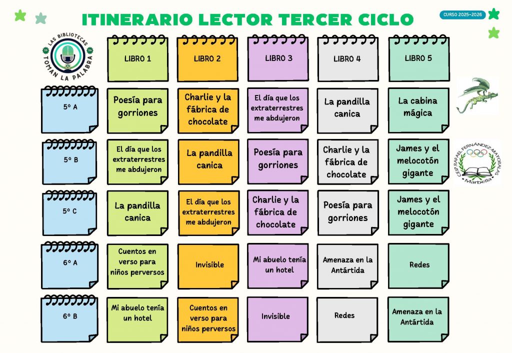 El itinerario recoge una selección de títulos adaptados a cada ciclo educativo, de manera que todos los niños y niñas del colegio disponen de propuestas de lectura adecuadas a su edad e intereses.